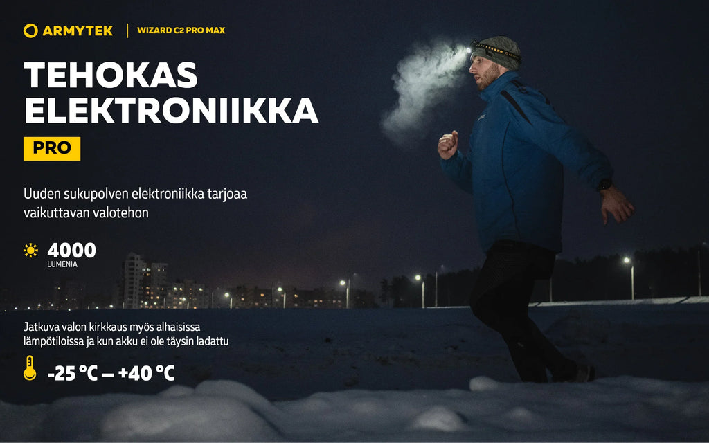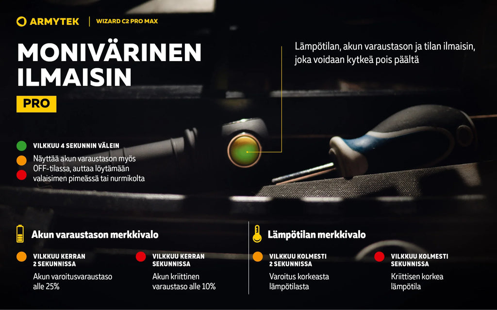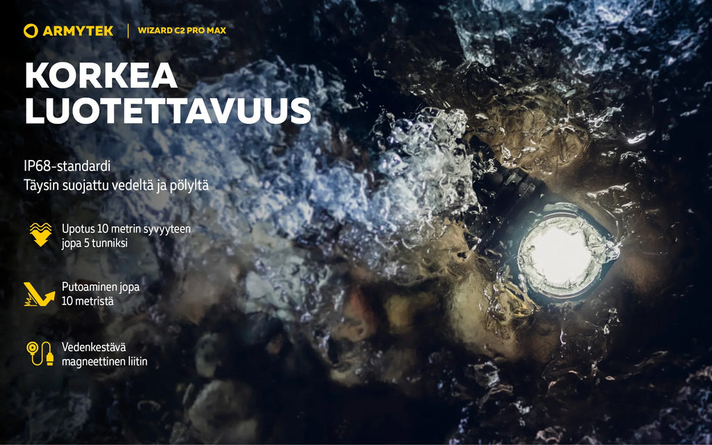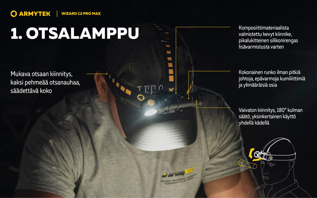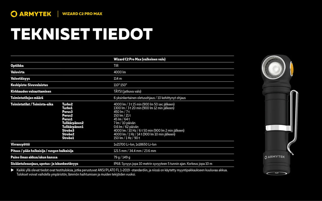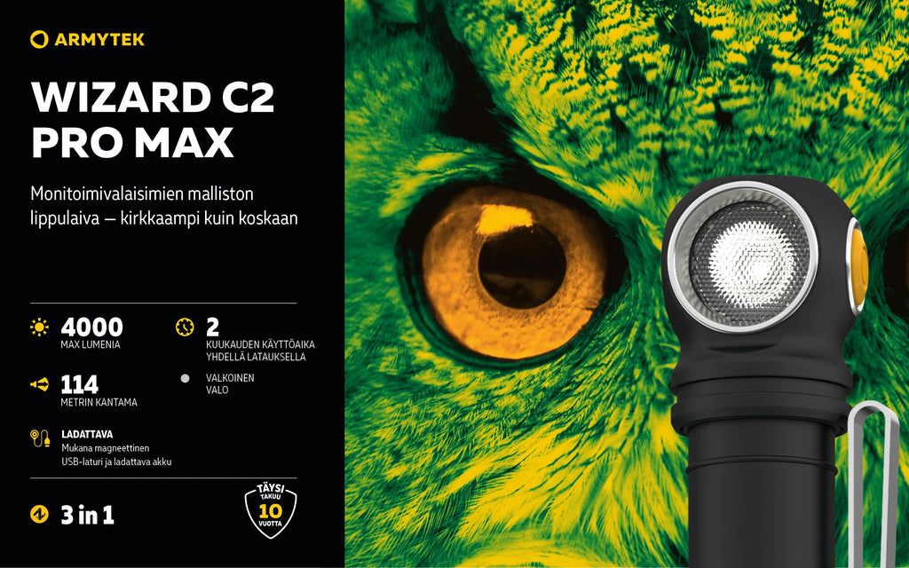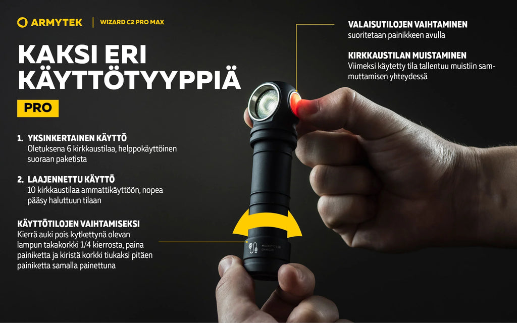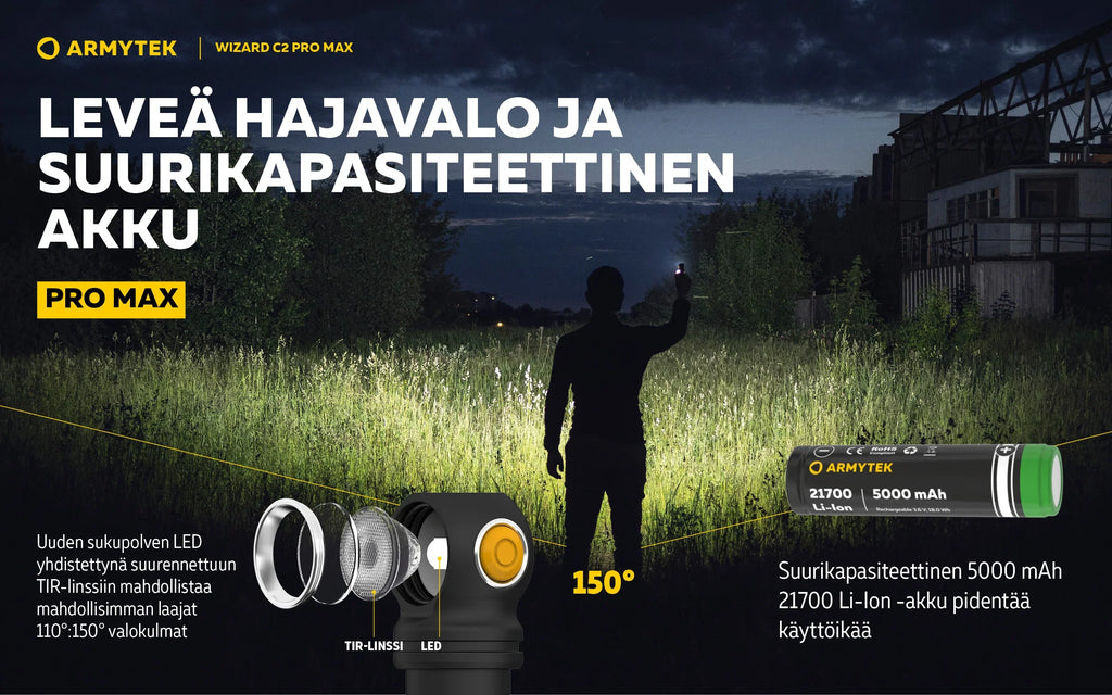 Wizard C2 Pro -valaisimen tärkeitä etuja ovat laajat 110°:150°-valokulmat ja entistä pehmeämpi siirtyminen keskipisteen ja sivuvalaistuksen välillä. Yhdessä 21700 Li-Ion suurikapasiteettisen akun kanssa nämä ominaisuudet tekevät käytöstä mahdollisimman mukavaa. Nopea magneettinen USB-lataus lataa taskulampun vain 5 tunnissa ja 20 minuutissa.